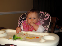 Chicken LOVED this puree and it was so easy to serve because it squirts out like toothpaste. Anyway, she ate spoonful after spoonful. Then she signed "finished" so we cleaned her up. She got very fussy and vocalized some complaints (we're guessing) so we signed "more" and gave her back her tray. She picked up her broccoli and started checking it out. It looked like she wasn't really sure what to do with it. I leaned over and took a little bite of it. Then she took a bite and offered it back to me. (She's really into sharing lately.) We went bite for bite for a few minutes. I offered her some more broccoli and she went to work eating it, picking it apart, and offering some to her dad.